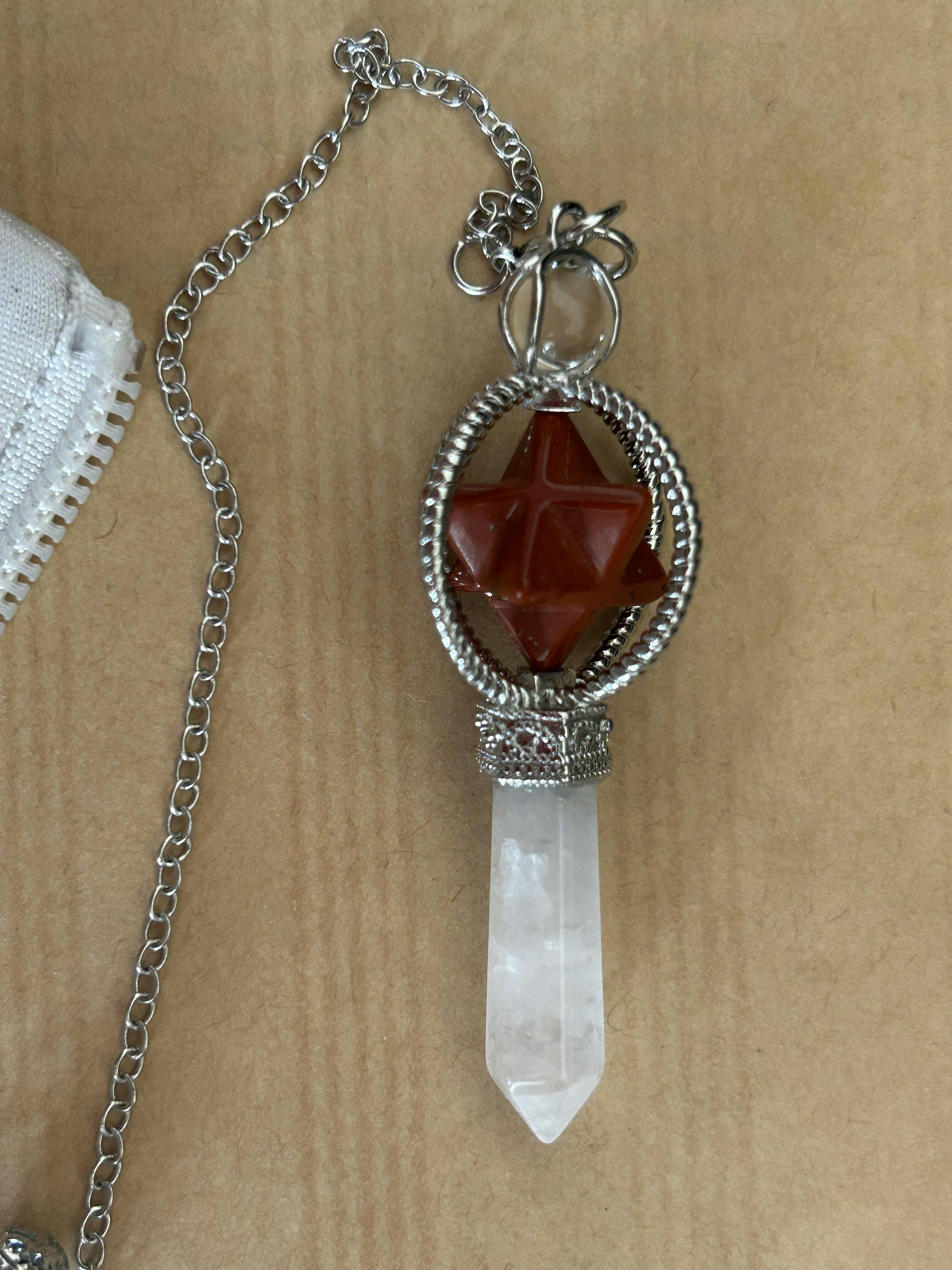 Explorez vos intuitions et harmonisez vos énergies avec ce pendule divinatoire Hexagramme au design géométrique raffiné. Conçu en pierres semi-précieuses – quartz rose, jaspe rouge, aventurine verte, obsidienne et plus encore – ce pendule est un outil spirituel puissant.